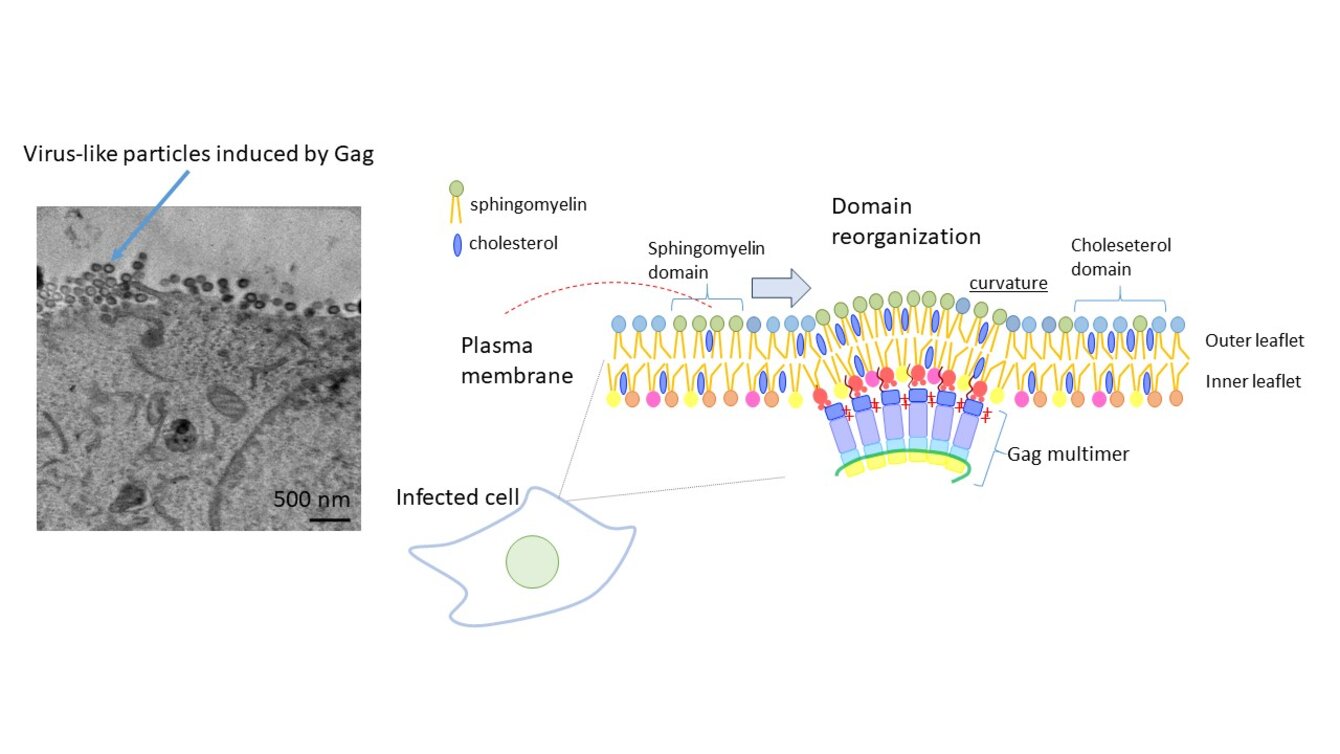 Human immunodeficiency virus type 1 (HIV-1) lipid envelope is obtained during budding from the plasma membrane of infected host cells. Interestingly, HIV-1 selects specific set of lipids such as sphingomyelin (SM) and cholesterol (Chol) that are important for virus activity. Viral Gag protein plays a central role in virus budding. Different quantitative and super-resolution microscopy techniques in combination with SM-specific and Chol-specific LBPs revealed that the expressed Gag recruits SM and Chol and induces fusion of SM-rich and Chol-rich domains.3 SM is distributed in the outer leaflet of the plasma membrane whereas Gag binds to the inner leaflet lipid phosphatidylinositol 4,5-bisphosphate (PI(4,5)P2). Thus, communication between outer and inner leaflet lipids is crucial for lipid recruitment by Gag. However, little is known about the interbilayer lipid communication in the biomembranes. Using molecular genetics and various LBPs, we will study molecular mechanisms that regulate interbilayer lipid communication. Our study will uncover how HIV-1 assembles its lipid coat. Our study will also provide essential information on membrane-mediated signal transduction.
