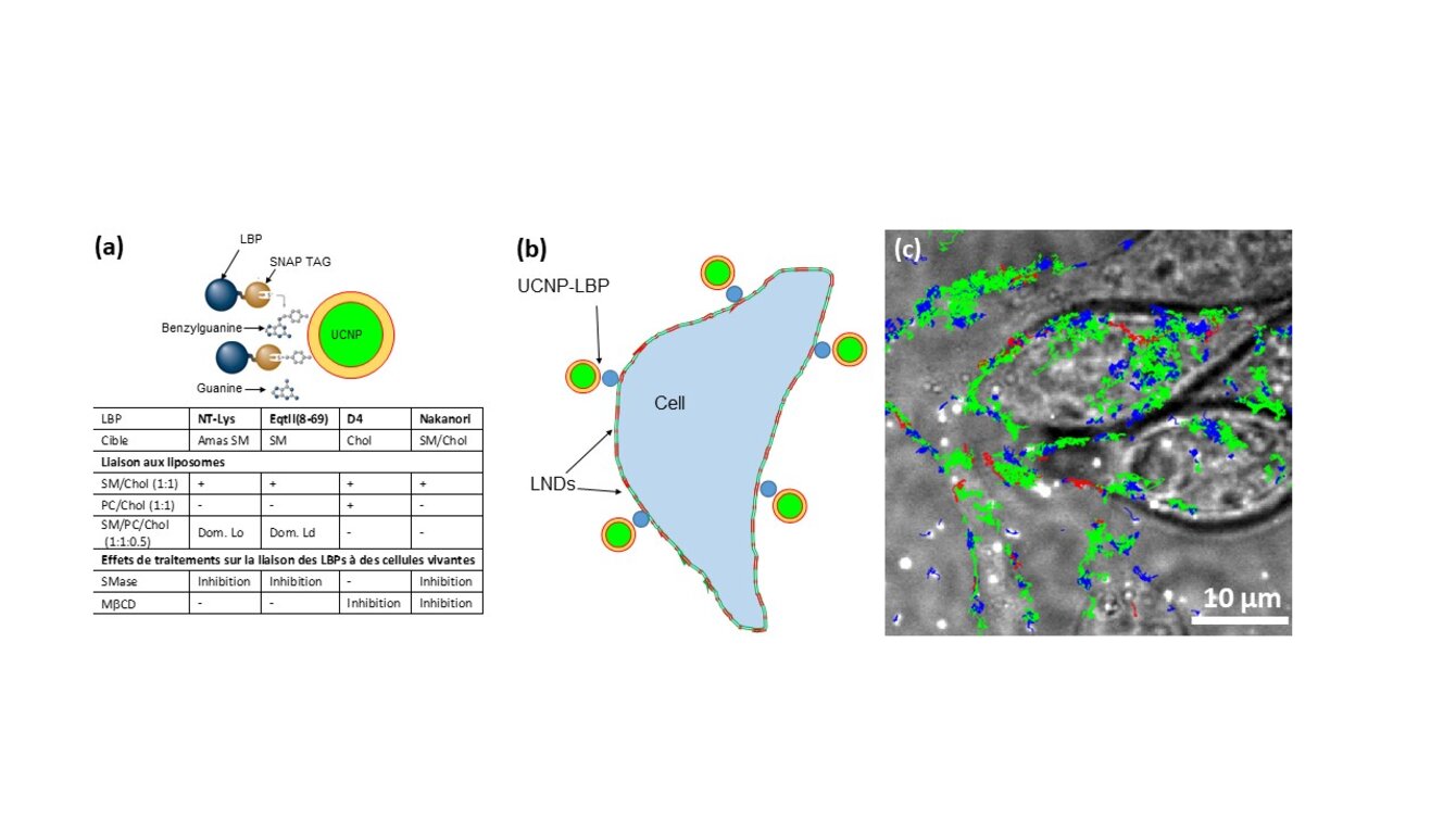 Au sein d’une membrane, la composition lipidique des feuillets externe et interne de la bicouche lipidique est différente et présente des hétérogénéités. La façon dont cette asymétrie/hétérogénéité est construite, maintenue et régulée reste mal comprise, tout comme son rôle. Nous avons développé une large palette d’outils innovants (sondes, protocoles, équipements) qui permet de caractériser et suivre ces organisations lipidiques in situ. En particulier, nous avons développé une série de sondes protéiques se liant spécifiquement à des lipides (LBPs pour lipid binding proteins) pour visualiser la distribution des lipides endogènes à l'échelle nanométrique.1,2 Notre objectif est d’utiliser ces LBPs pour étudier les mécanismes moléculaires régulant la distribution des lipides ainsi que leurs dynamiques. Nous couplerons également les LBPs à des nanoparticules à conversion ascendante (UCNPs pour up-converting nanoparticles) pour suivre la dynamique à long terme de nano domaines lipidiques (NDLs). Enfin, nous caractériserons la structure et le devenir intracellulaire de nanoparticules lipidiques encapsulant des ARNm (LNPs pour lipid nano-particles) utilisées en stratégie vaccinale.